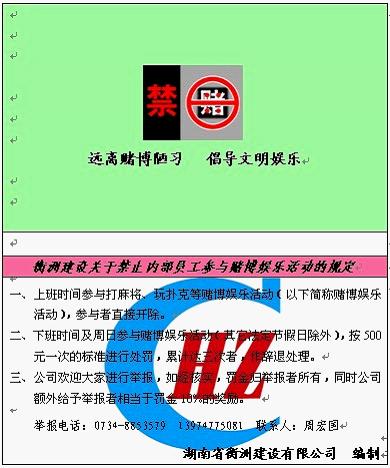 為了引導(dǎo)員工文明娛樂,遠(yuǎn)離賭博陋習(xí),公司于2011年4月起正式推行禁賭令,并特制了禁賭卡分發(fā)給每一個本部員工,此舉贏得了大家的認(rèn)同,有效的遏制了賭博現(xiàn)象,提高企業(yè)員工的工作效率。