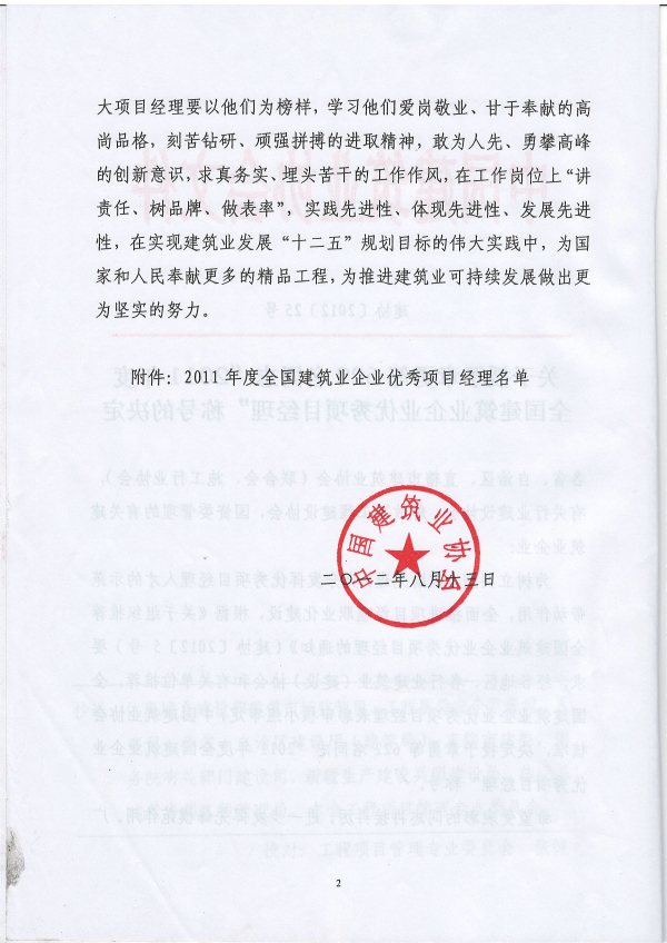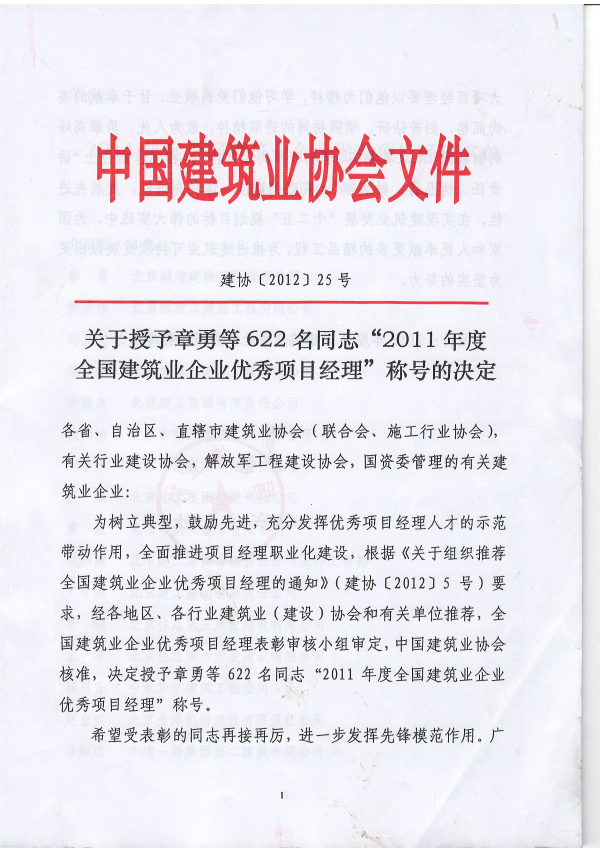 8月22日—23日,由中國建筑業(yè)協(xié)會主辦的“紀念國務院推廣魯布革工程管理經(jīng)驗25周年大會暨第十一屆中國國際工程管理峰會”在天津市召開。會上表彰了2011年度全國建筑業(yè)企業(yè)優(yōu)秀項目經(jīng)理,我司段鑫同志獲得了該項榮譽。此次,共有來自全國各地區(qū)、各行業(yè)建筑業(yè)(建設)協(xié)會和有關單位推薦的的622名同志獲得了該殊榮。