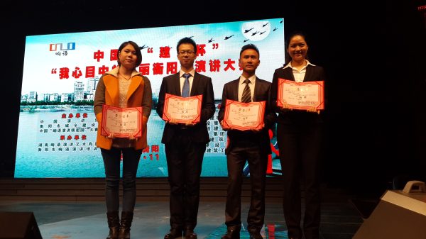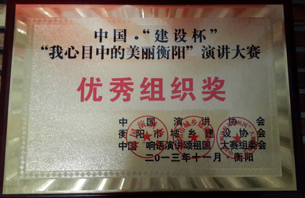 本次大賽是為了宣傳貫徹黨的十八大精神,呼應(yīng)2014年將在長沙舉辦的中國•“我心目中的理想社區(qū)”全國演講大賽,推進美麗衡陽建設(shè),以演講的正能量為實現(xiàn)“中國夢”提供鏗鏘發(fā)聲的舞臺。經(jīng)中國演講協(xié)會、市城鄉(xiāng)建設(shè)協(xié)會、中國“響語演講頌祖國”大賽組委會研究,決定在全市范圍內(nèi)舉辦中國“建設(shè)杯”•“我心目中的美麗衡陽”演講大賽。經(jīng)過半年的緊張籌備,通過100余名演講選手參賽海選、51名演講選手復(fù)賽,最終有26名種子選手站在了演講決賽的舞臺。我司謝夢陽、唐霞、李瑩、曾勝四人演講《因?qū)W⒍绕稹窐s獲一等獎,謝夢陽、唐霞的個人演講分獲二、三等獎。公司代表隊榮獲中國•建設(shè)杯•“我心目中的美麗衡陽”演講賽優(yōu)秀組織獎。